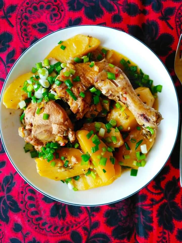 Доброе утро! Сегодня про простое, " дежурное" блюдо. Практически диетическое жаркое. Картофель для такого жаркого не обжариваем. Из мяса прекрасно подойдет нежирный цыпленок. Цыпленка нарубить порционно и слегка обжарить, до зарумянивания. Сложить в кастрюлю. Соль, перец, кориандр, хмели - сунели. Картофель почистить, нарезать довольно крупно и добавить в кастрюлю, к цыпленку. Луковицу спассеровать на сливочном масле и ваести в кастрюлю. Соль, копченая паприка, лавровый лист. Долить в кастрюлю воды, до половины объема продукта, приправу из сушеных кореньев.И тушить, на небольшом огне, прикрыв крышку, до готовности. Заправить зеленью и щепоткой чеснока.