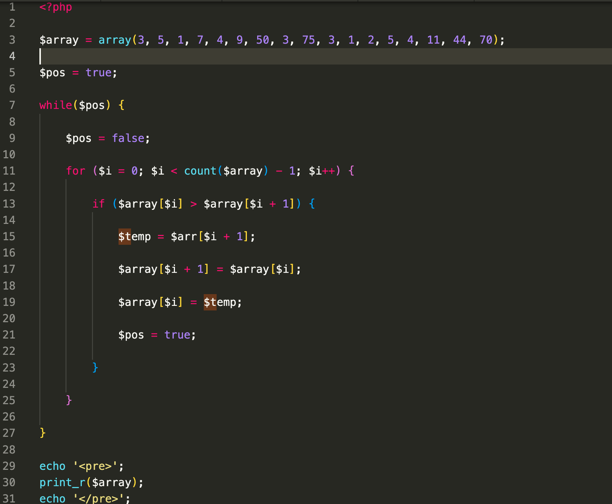 Данный алгоритм включает в себя повторяющиеся проходы по сортируемому массивы. При каждой итерации элементы сравниваются между собой попарно. Если порядок в паре неверный, то происходит обмен. Сравнение будет происходить до тех пор, пока при очередной итерации не окажется, что обмен больше не нужен. Данный алгоритм получил свое название, исходя из того, что элемент стоящий не на своем месте, «всплывает» до необходимой позиции как «пузырек». Пример: