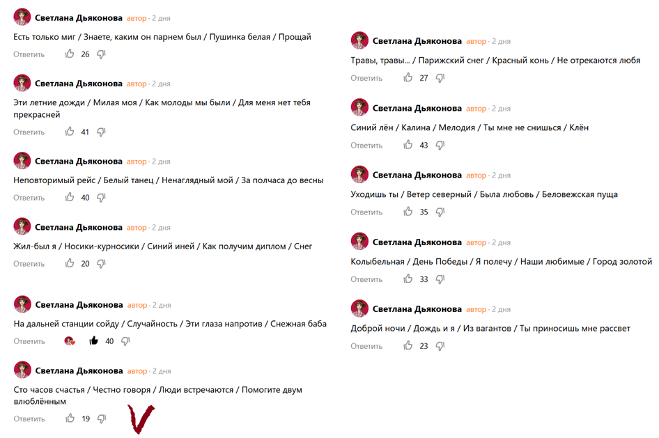 И это 4-й этап голосования. Добрый день! Для тех, кто у нас на канале впервые, хочу пояснить. Мы проводим своеобразный проект-марафон, где собираем любимые песни читателей, а затем по очереди рассказываем о них. В последнюю очередь прозвучат 5 самых любимых песен, отобранных в результате голосования. Ну а сегодня вспоминаем 4 песни, которые набрали меньше голосов в 3-м туре. Александр Терентьев: А можно включить песню "Сто часов счастья" Константина Орбеляна и Вероники Тушновой, 1977 года? Эта песня, с блестящим соло медных труб (!), затрагивает в человеке всё самое сокровенное, невзирая на возраст, и очень полезно, на мой взгляд, ещё только входящим в жизнь людям. Светлана: А я нашла эту песню в исполнении Эрны Юзбашьян. Думаю, многим будет интересно послушать. А для кого-то будет открытием (люблю такие моменты!) Галина Маркова: "Честно говоря" (1973) группы "Цветы". Стихи Михаила Ножкина, музыка Сергея Дьячкова. Легендарная песня, актуальная и по сей день. Помню, как мы пели её сн