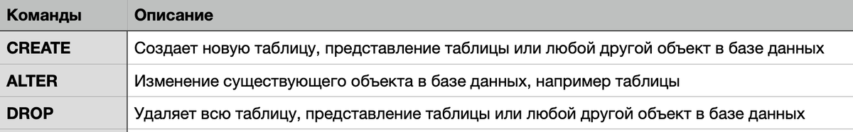 В чем отличие между Delete/Truncate/Drop? (вопрос раскрыт не до конца, будет обновляться=) ) Delete - команда, которая используется для удаления строк из таблицы; Truncate - команда, которая используется для удаления всех строк и очистки пространства в таблице; Drop - команда, которая используется для удаления объекта из базы данных; Что такое алиас(as) в запросах SQL? Это временное имя присвоенное таблице или столбцу таблицы для целей конкретного SQL-запроса Классификации команд в SQL DDL (Data Definition Language, Язык Определения Данных) - группа команд для определения данных, т.е. это те команды, которые позволяют определять структуру БД, позволяют удалять, создавать и изменять объекты базы данных. DML (Data Manipulation Language, Язык Манипулирования Даными) - группа команд для манипулирования данными, т.е. это команды которые позволяют выгружать, изменять, добавлять или удалять данные из базы. DCL (Data Control Language, Язык Управления Данными) - группа операторов, которые опре