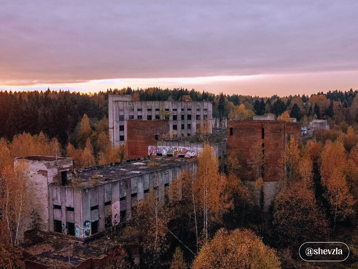 Подъезжая к концу Заводской улицы начинаешь видеть проглядывающие из-за деревьев руины внушительного по размерам сооружения: несколько корпусов, объединенных в общий массив. Вместо верхних этажей торчит частокол арматуры, а вместо окон — темные «глазницы».
