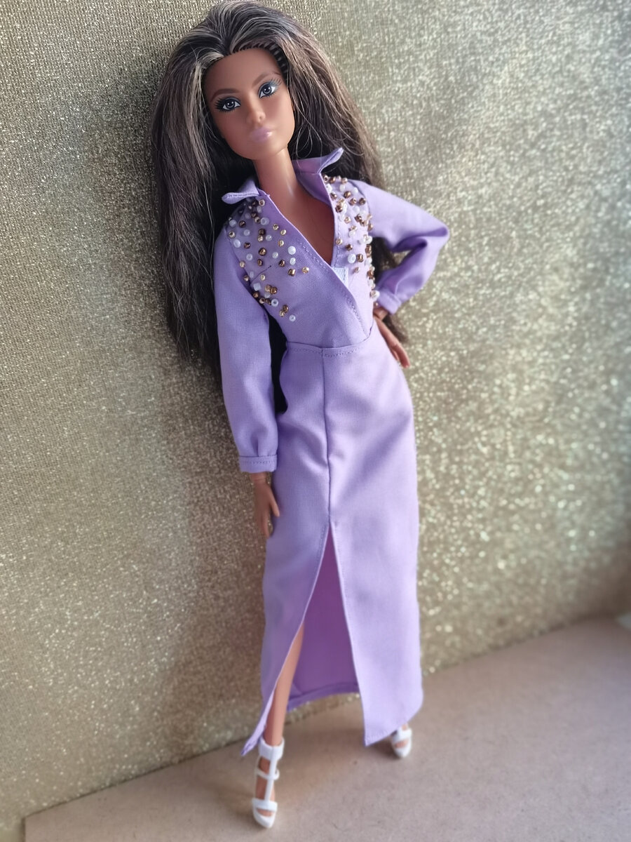 Сегодня буду показывать вам последний сшитый костюм для барби. Сиреневый мой любимый цвет и я давно хотела сшить что-нибудь такого цвета. На прошлой неделе по платному курсу мы шили рубашку, поэтому выбор пал на сиреневую рубашку для пышки. Но после примерки рубашка пышке оказалась мала( Я не долго думая померила рубашку на стандартную барби. Ей вполне подошел размер. Потом я долго думала, что же сшить к рубашке, брюки или юбку. С брюками мне показалось, что комплект будет чем-то напоминать мне костюм Элвиса Пресли) Поэтому сшила юбку. Не сказала бы, что этот наряд очень идет Лине, больше он бы подошел какой-нибудь блондинке со светлым скинтоном, но у меня блондинок на стандартном теле нет( А у Лины самый светлый скинтон и розовая помада губ, поэтому более менее как-то наряд на ней смотрится) По итогу я немного разочарована этим цветом в одежде. После того как я сшила рубашку, я перелопатила весь интернет в поисках по - настоящему красивого сиреневого платья, чтобы сшить более мене