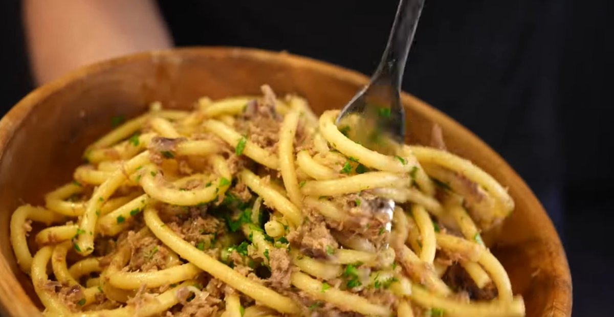 Отваренные макароны смешиваем с нашим фаршем, перчим, солим по вкусу, добавим немного масла для большей жирности. Последним моментом добавим нарезанную петрушку. Перемешиваем блюдо и подаём на стол!