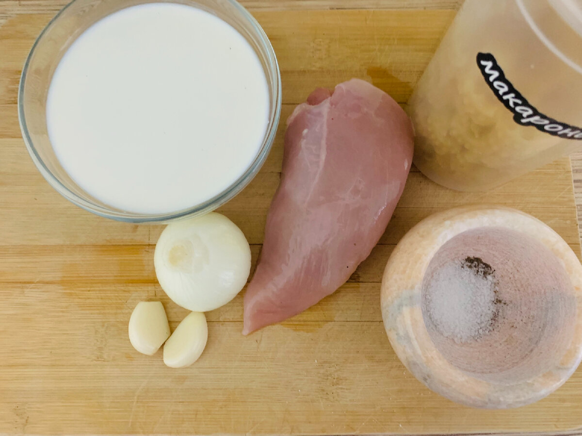 Быстрый ужин за 30 минут из доступных ингредиентов. Ингредиенты: Для начало мелко нарезаем лук и обжариваем его на предварительно разогретой сковородке до золотистого цвета. Курицу нарезаем кубиками и добавляем в сковороду. После того как курица подрумянилась, добавляем соль, перец , протертый чеснок. Все хорошенько примешиваем. Предварительно разогреваем сливки и добавляем в сковороду. Готовим под крышкой на медленном огне 5-7 минут. Гарнир может быть любой, у нас сегодня макароны. Также сверху можно добавить сыр. Всем приятного аппетита!