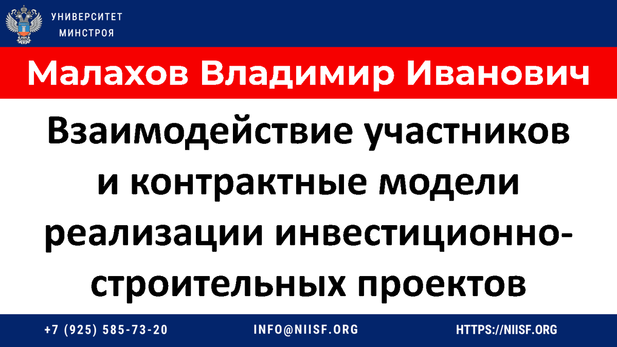 Спикер: Малахов Владимир Иванович - Директор департамента проектного инжиниринга, Вице-президент НПИ (Национальной Палаты Инженеров) по инженерному консалтингу в строительстве – СТГМ, Президент Бизнес-школы Инвестиционно-Строительного Консалтинга, Инжиниринга и Девелопмента – БИСКИД, к.э.н., Доктор делового администрирования (Doctor of Business Administration), DBA