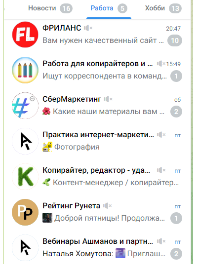 - Все чаты у пользователя находятся в одном окне, так что промоканал регулярно попадается на глаза.