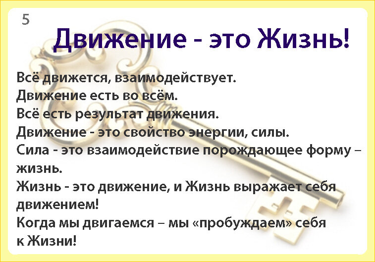 Движение – это РАЗ – активность процессов жизни – обмен веществ, все взаимодействия в организме – Сила Жизни. Это отражается мыслью, что активизирует и выстраивает наше мышление. Всё это выражается нашей способностью реагировать, сосредотачиваться, анализировать, ясно мыслить, принимать решения и предпринимать действия в достижении своих целей. Так мы развиваемся! Жизнь - есть движение, и движение создаёт жизнь! Всё движется, взаимодействует. Движение есть во всём. И всё есть результат движения. Движение - это свойство энергии, силы. Сила это взаимодействие порождающее форму – жизнь. Жизнь – это движение, и жизнь выражает себя движением! Когда мы двигаемся – мы "пробуждаем" себя к Жизни! - движение лимфы и крови, жидкостей в организме, что обеспечивает все процессы жизнедеятельности в организме; - это развитие, как самого организма, нейронных связей головного мозга, так и социальных связей; - это мышление которое определяет, как мы воспринимаем, мыслим, принимаем решения, достигаем жел