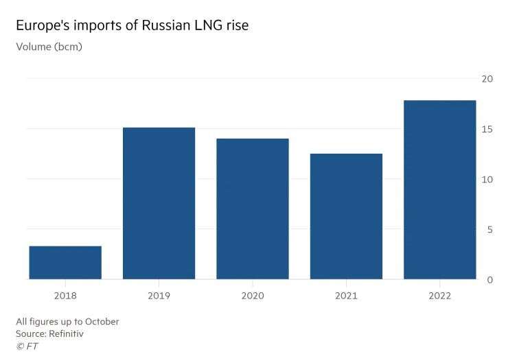 Импорт российского сжиженного природного газа вырос на 42% в период с января по октябрь этого года по сравнению с тем же периодом 2021 года, пишет FT. По данным издания, доля СПГ из России составила 16% от общего европейского морского импорта за десять месяцев (около 17,8 млрд куб. м). Почти все объемы пришлось на Францию, Бельгию, Испанию и Нидерланды.