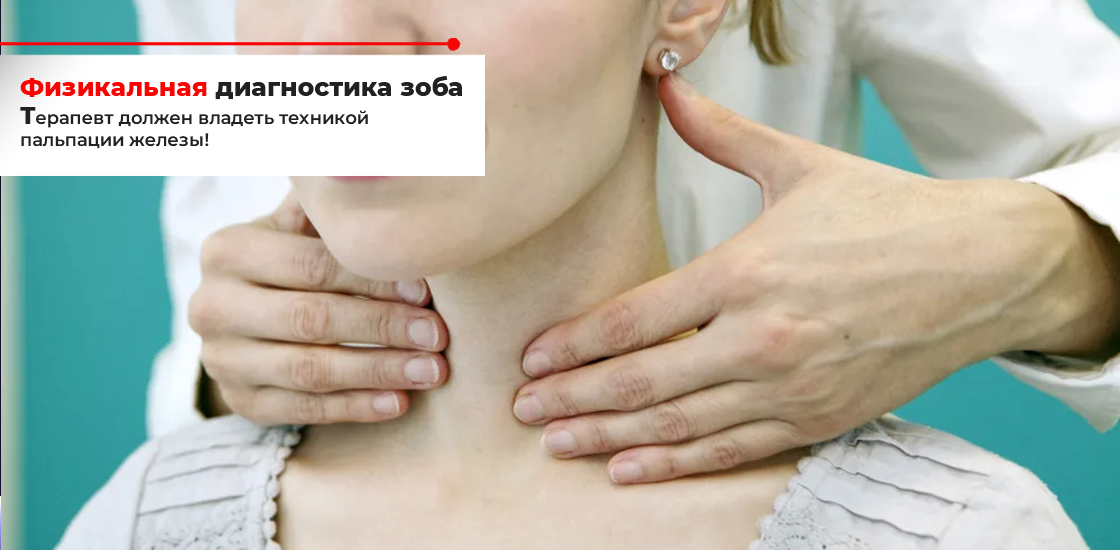 Пальпация щитовидной железы – самый простой и быстрый способ диагностики зоба. Техника исследования очень важна. Пальпация щитовидной железы проводится со спины: врач помещает пальцы на передний край грудино-ключично-сосцевидной мышцы и предлагает пациенту стаканчик с водой. При глотании под пальцами будет ощущаться смещение щитовидной железы, которое, при наличии навыков, позволит определить её размеры, консистенцию и подвижность.
