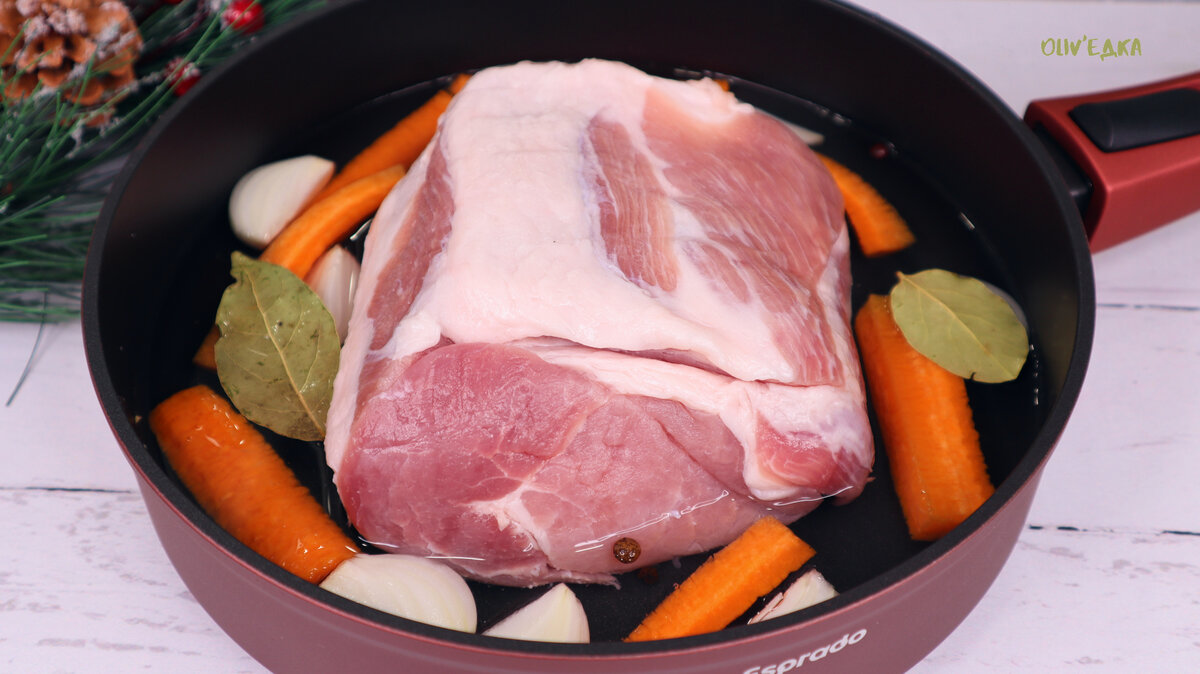 При таком способе приготовления мясо получается необыкновенно нежным, что ломается просто вилкой, даже нож не нужен. Рецепт удобен тем, что свинину можно отварить заранее, а непосредственно перед подачей останется только запечь медальоны. Таким образом времени на приготовление перед праздником уйдет значительно меньше. Готовим 👨🏻🍳 Подробный видео рецепт и ингредиенты можно посмотреть в конце статьи⤵️ Беру свинину, хороший кусочек (Карбонад). Кладу в сковороду или форму для запекания. У меня сковорода со съемной ручкой, поэтому готовила всё в ней. Наливаю воду. Солю воду. Добавляю Лавровый лист, черный перец горошком и душистый перец горошком, лук нарезанный крупными дольками, и морковь нарезанную брусочками. накрываю фольгой и убираю в разогретую до 120 градусов духовку на 4 часа. Мясо долго томиться, с температурой и временем я не ошиблась, так всё и задумано 😉 Если кусок вас крупнее, то держим в духовке больше 4 часов. Это несложный рецепт, поставили в духовку и пошли заниматьс