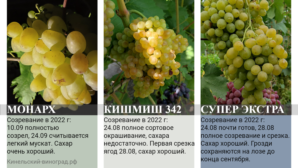 Послезавтра стартует проект Новогодняя елка виноградных желаний, в рамках которого три счастливчика получат «под елочку» саженцы винограда из каталога питомника - кинельский-виноград.рф. Пока вы делаете свой выбор, буду рассказывать о наших любимых сортах, чтобы вам было легче определиться. Сегодня представлю три проверенных временем винограда из нашего каталога. Кто занимается виноградарством давно, отлично с ними знаком, сажают их от Москвы и Подмосковья до Новосибирска точно, дальше я просто не отслеживала. В таблице написала, как Монарх, кишмиш 342 и Супер Экстра показали себя в этом самом, наверное, неблагополучном сезоне за последние 10 лет. Если сказать коротко, буквально одним словом, то не подвели. Каждый добрал нужное количество сахара, окрасился, более того, приличный возраст кустов, добавил своих нюансов и красок каждому винограду. Монарх, несмотря на то, что настоящее лето у нас в регионе было только в июле, а август и сентябрь были очень сдержанными и непривычно прохладны