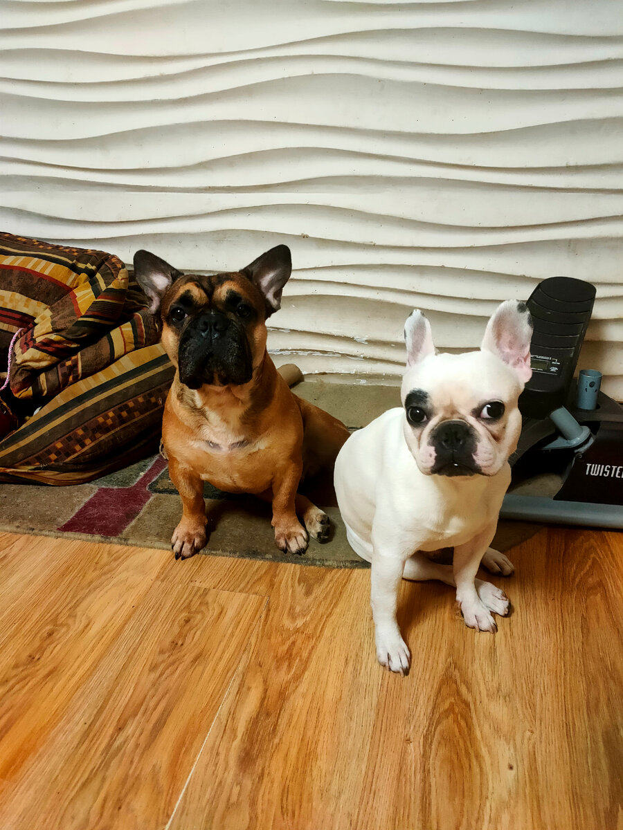 Все французики абсолютно разные, вот и наши отличаются сильно не только внешне, но и характерами. Пухлю часто путают с бостонами. Он весит всего 11 кг, лапки длинные, складочек мало, такой весь стройняшка. А Гизмо весит 16 кг, у него нет лишнего веса, он сам по себе крупный, широкая спина, лапки короткие. Пухля уже в годик стал взрослой собакой, защитником, а Гизмо в свои 3 годика ещё ведёт себя как щенок. Они отличаются и характерами, и привычками. Пухля старательно обходит лужи, предпочитает ходить по натоптанным тропинкам. А Гизмо скачет по кустам, лужам, сугробам. Французики плохо переносят жару, но у Гизмо есть привычка с детства - залезать под одеяло и хотя бы минут 10 там полежать, даже летом. Пухля никогда так не делает. Гизмо любит палочки, но сам ни разу ни одной в лесу не взял. Он ждёт пока Пухля выберет, донесет до дома и начинает уже отбирать. Гизмо влюбился в соседскую бульдожку. Иначе назвать это не могу: каждую прогулку тянет к ее дому, высматривает. Пухля же пре