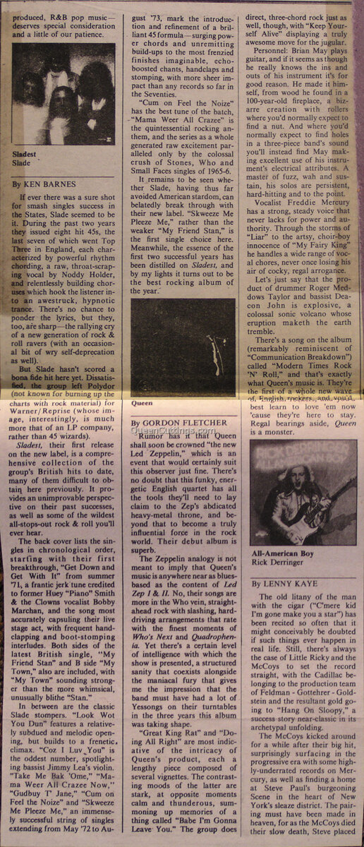Ходят слухи, что Queen вскорости будут коронованы как «новые Led Zeppelin», что станет событием, очень подходящим мне как наблюдателю. Нет сомнения, что этот энергичный, неординарный английский квартет отлично вооружен всем тем, что им нужно для того, чтобы потребовать трон хеви-метал, от которого отреклись Led Zeppelin. Более того, они, вероятно, перерастут эти рамки и станут действительно влиятельной силой в мире рока. Их дебютный альбом восхитителен.