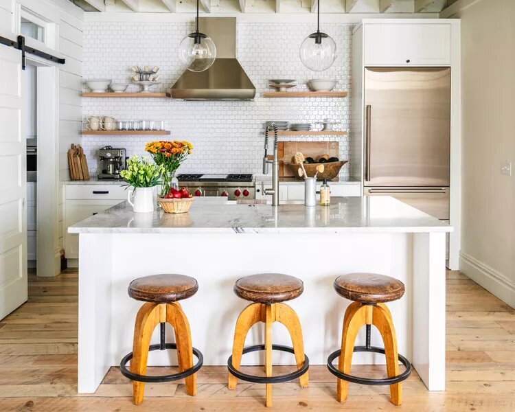 Разбавьте белоснежную кухню деревянными акцентами, такими как открытые навесные полки, деревянные полы и кожаные барные стулья. Черные акценты, в том числе фурнитура и подвесное освещение, добавляют контраст нейтральной цветовой палитре, а стеклянные абажуры и открытые полки делают пространство легким и воздушным.