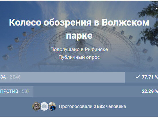 В Рыбинске по прежнему не утихают споры по поводу установки колеса обозрения. Градостроительный совет города уже дал свое «добро» на размещение колеса обозрения в Волжском парке, на выбранном месте. Но градозащитники продолжают поднимать волну негатива в социальных сетях, требуя переноса аттракциона как можно далее от берега Волги и от центра Рыбинска. Но даже на странице у ярых градозащитников их собственные подписчики отдают пальму первенства размещению у Водоканала, то есть, ближе к центру Рыбинска. Как показали опросы, размещенные в различных социальных сетях, жители Рыбинска в своей массе скорее за колесо, нежели против. В различных социальных сетях и в нескольких группах Вконтакте в каждом опросе проголосовало от 3000 до 5000 человек. И более двух третей опрошенных не возражают против установки колеса. А кое где «За» высказываются более 75 процентов проголосовавших. Большую часть опросов запустил депутат муниципалитета Рыбинска Олег Леонтьев. Возможно, в городе грядет повторное о