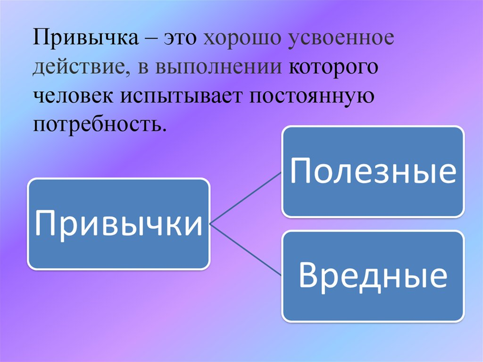 То, что человек делает регулярно, не особо задумываясь о последствиях, является привычкой, то есть поведением, прочно вошедшим в его жизнь. Привычки могут кардинально менять характер и судьбу человека. Полезные привычки Полезные привычки способствуют сохранению как физического, так и психологического здоровья. Безусловно, полезные привычки: 1. Правильно дышать. Вдыхать воздух следует носом. При этом выполняется защитная функция его очищения, увлажнения и обеззараживания. 2. Вкушать пищу следует не торопясь. Перед тем, как проглотить еду, необходимо совершить максимальное количество жевательных движений. За это время щелочная слюна нейтрализует кислую среду, разрушающую эмаль зубов. Процесс пищеварения происходит легче, уменьшается опасность возникновения болезней ЖКТ. 3. Правильно ухаживать за зубами. Зубные щетки следует регулярно менять, поскольку на них задерживаются бактерии. Полезно чистить зубы несколько раз в день, чтобы своевременно избавляться от быстро образующегося зубного н