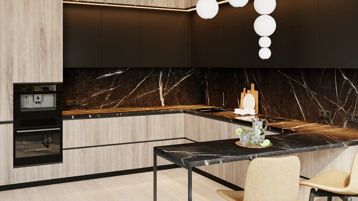 «Тауп» — это один из самых универсальных и востребованных пастельных оттенков коричневого цвета. Он успокаивает и расслабляет в зависимости от окружения. В сочетании с тёмно-коричневыми фасадами и чёрной столешницей придает строгой кухне мягкость, тепло, и уют, словно сглаживая острые углы и прямые линии индустриального пространства.