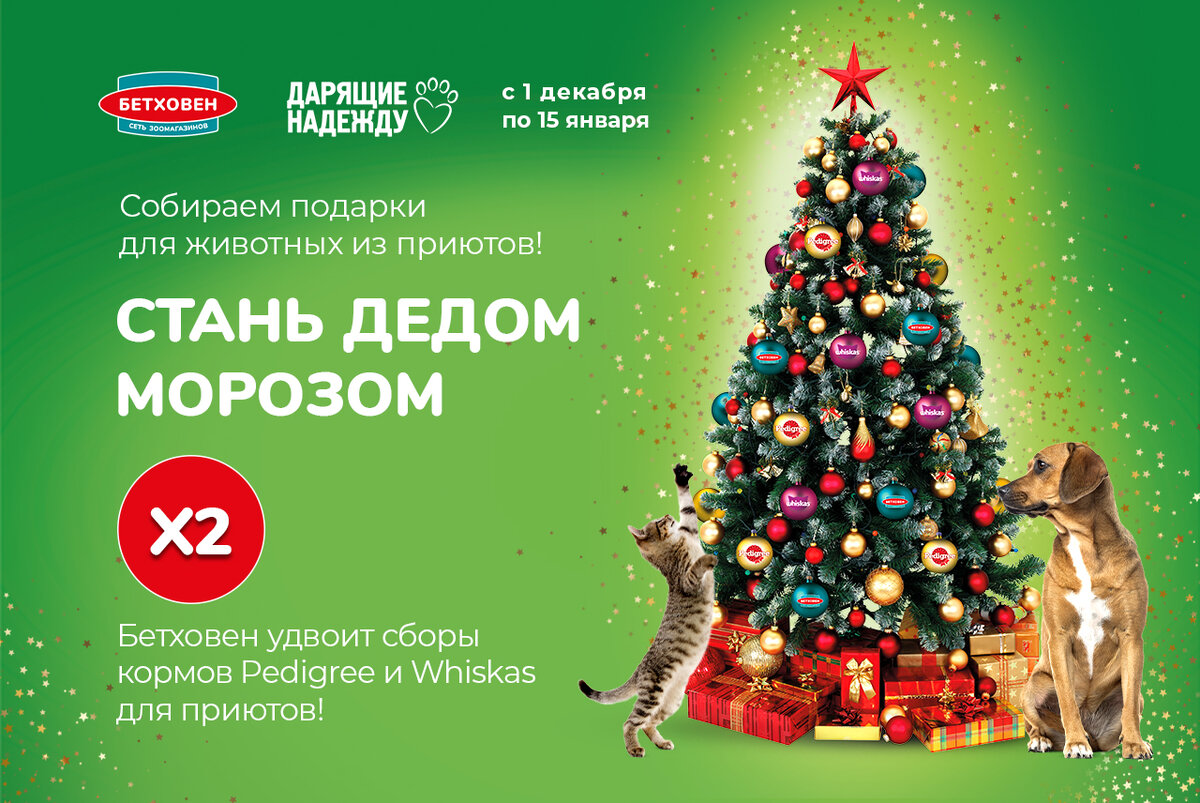Дорогие друзья! Компания «Бетховен» и фонд «Дарящие надежду» с 1 декабря по 15 января проводят свою ежегодную новогоднюю, акцию по сбору кормов и подарков «Стань Дедом Морозом». В этой раз мы собираем подарки для 6 приютов: ∙ «Кожуховский» ∙ «ДвориКо» ∙ «Верный друзья» ∙ «Гафландия» ∙ «Песель и КО» ∙ «Котохата» У каждого из приютов своя история и свои просьбы, но объединяет их безмерная любовь к бездомным животными и желание им помогать. Сеть зоомагазинов «Бетховен» предлагает присоединиться каждому желающему к этой волшебной акции. Купите товары для собак и кошек и положите в корзины для сбора благотворительности. А если вы купите корма Pedigree и Whiskas, то «Бетховен» их удвоит, а все собранные подарки направит в приюты из списка. Если вы хотите помочь бездомным животным не выходя из дома, то можете сделать это на нашей страничке КЛУБ БОЛЬШИХ СЕРДЕЦ