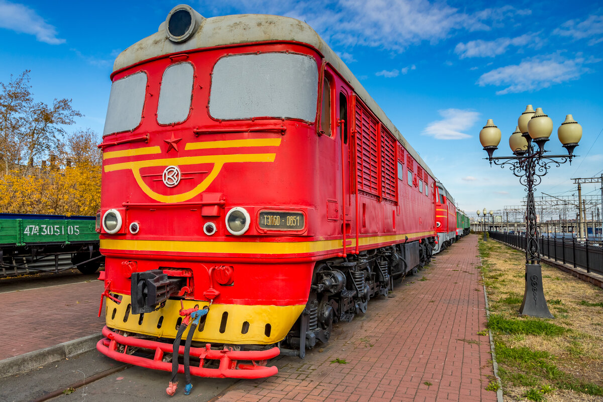 Прошлой осенью довелось мне побывать в славном городе Челябинске и посетить музей Южноуральской железной дороги. С 2005 года у музея работает площадка на станции Челябинск-Главный. На ней расположена экспозиция подвижного состава. Сегодня покажу Тепловоз ТЭП60-0851. У меня в коллекции есть похожий тепловоз ТЭП60-0190, построенный Коломенским заводом в 1967 году, он находится в экспозиции музея Октябрьской ЖД в Санкт-Петербурге. Челябинский тепловоз ТЭП60-0851 построен позже - в 1978 году. До поступления в 2009 году в музей, тепловоз трудился в локомотивном депо Саратов. Тепловозы серии ТЭП60 - являются первыми советскими тепловозами разработанными специально для пассажирских поездов. Выпускались с 1960 по 1985 год на Коломенском тепловозостроительном заводе , отсюда и индекс серии "60". В 1963 году, во время испытаний ТЭП60 развил рекордную скорость для тепловозов - 193 км/час. Выпускалась двухсекционная модификация 2ТЭП60. Всего за время выпуска был изготовлен 1241 тепловоз.