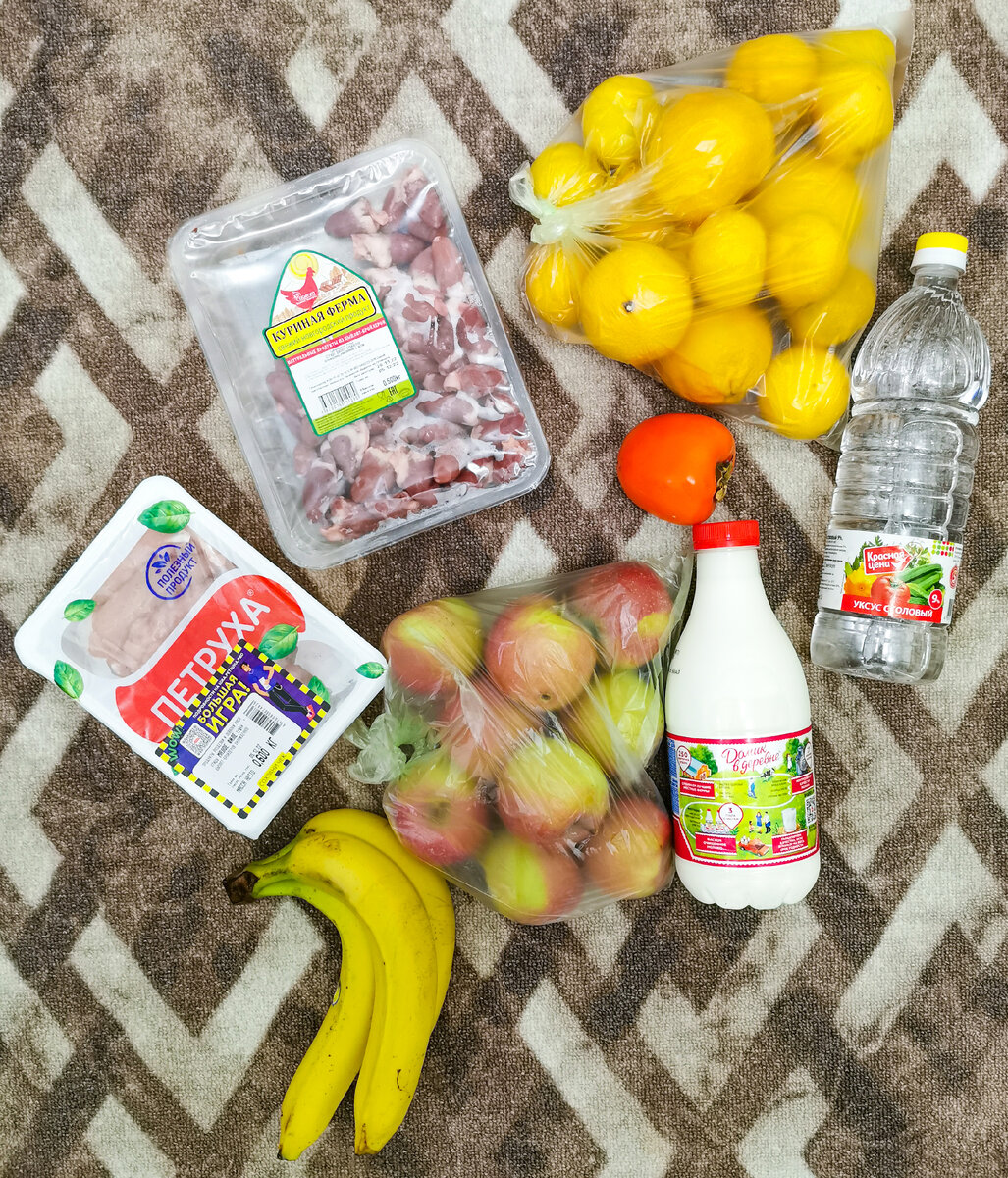 По пути домой зашла в магазин. Надо было купить молоко и уксус. Заодно мандарины купила, яблоки, бананы и куриные запчасти.