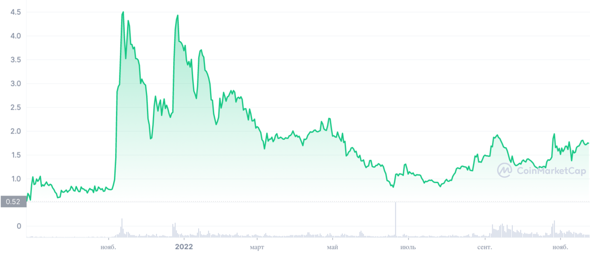 Криптозима повлияла на Toncoin, как и на большинство криптовалют. По данным CoinMarketCap, 27 декабря 2021 года курс достиг пика в $4,5 за монету, после чего начался спад. Ценовые максимумы в 2022 году – $2,8 10 февраля и $2,3 29 апреля. Последние месяцы монета торгуется в диапазоне $0,81-1,95 с ежедневным объемом торгов в $5 млн. Минимальный курс криптовалюты за последние полгода – 0,81 доллара. Сейчас токен находится в фазе устойчивого роста.