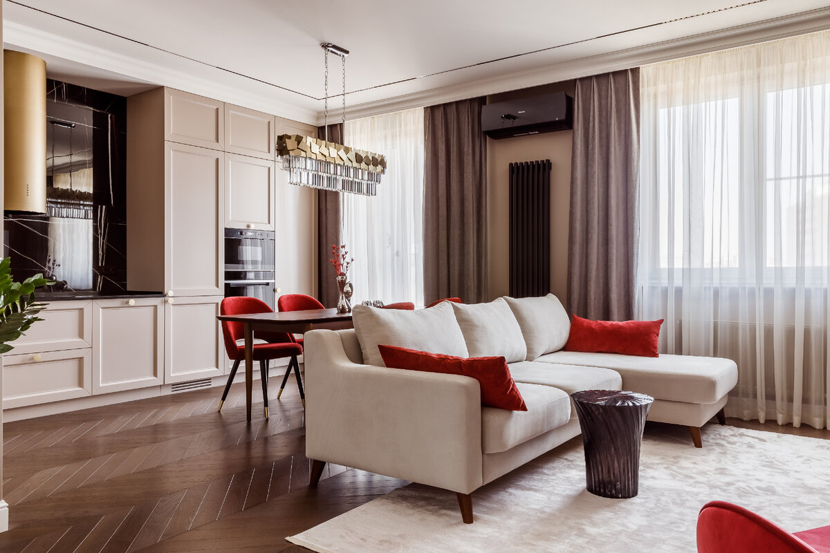Кухня изготовлена из комбинированных материалов в три яруса. Верхние шкафы из металлического профиля со стеклом MORU с подсветкой внутри.