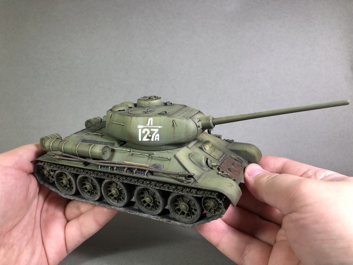 Здравствуйте, друзья! Представляю вам модель, так сказать, «выходного дня». В прошлом году у меня был небольшой творческий кризис, и немного поднадоело снимать видосы и собирать модели, поэтому я сделал паузу где-то в полгода от моделизма. И дабы руки не боялись взяться за более сложные модели, я решил собрать модель «на лайте». А какая модель для этих целей подходит лучше, чем тридцатьчетверка? Поэтому модель собралась полностью из коробки, без каких-либо переделок и внимания к мелочам. Восстановил фактуру литья на башне после склеивания двух половинок с помощью густой грунтовки Tamiya 87075. Модель загрунтовал в черный грунт A.mig-2005. Далее модель задул одним из многочисленных оттенков советского зеленого так же от Аммо Миг (уже и не помню номера краски), стараясь полностью не перекрыть черный грунт в теневых областях модели. После этого довил в базовый цвет немного светло-желтого оттенка и нанес кистью на выступающие детали модели (заклепки, поручни и тд.), намеренно делая модель
