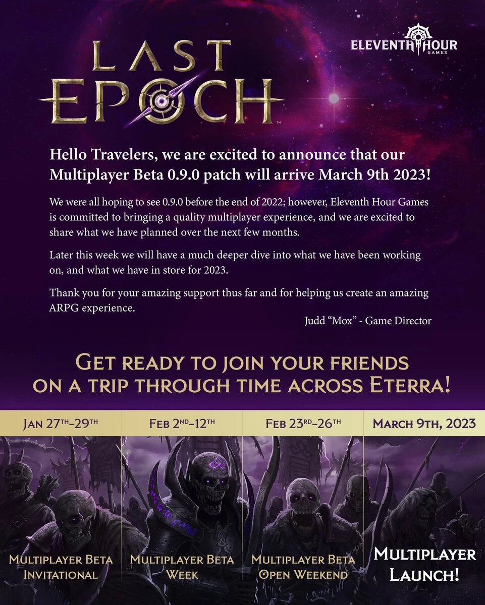 Отличные новости для всех поклонников качественных “диаблоидов”. Разработчики Last Epoch из студии Eleventh Hour Games наконец-то поделились датами, когда их детище получит кооперативный режим. Бета-тестирование мультиплеера начнется 27 января 2023 года. В течение февраля пройдет несколько этапов теста, а 9 марта он выйдет в релиз. Вообще, кооператив должен был появиться ближе к концу этого года, но разработчики приняли решение перенести его на первый квартал 2023-го, чтобы уделить больше времени отладке режима. Last Epoch сейчас находится в раннем доступе. Игра имеет очень положительные отзывы от игроков (86%) на основании 12500 мнений.