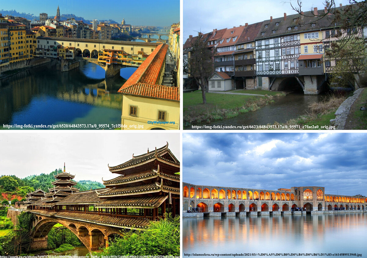 Неизвестно, кто и когда впервые задумал совместить две таких, казалось бы, скучных архитектурных конструкции, как мост и дом. Но идея эта оказалась поистине гениальной и неисчерпаемой. И успешно использовалась она в разных культурах и в разные эпохи. Использовалась, используется и, наверное, будет использоваться ещё очень очень долго.
