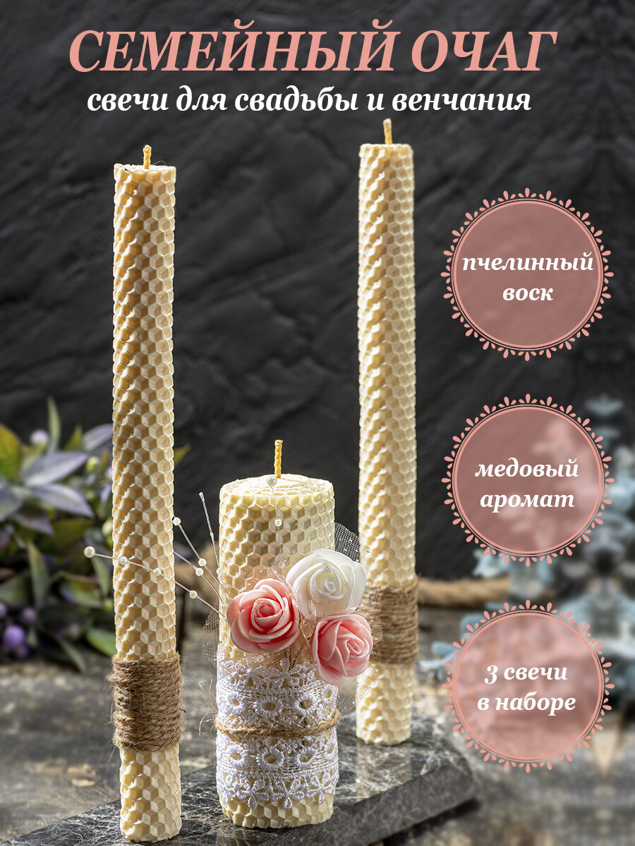Свечи Семейный очаг – символ благополучия, единства, родства. Натуральные медовые свечи из вощины для свадьбы и венчания. Набор состоит из 3 подарочных свечей: 1 свеча для молодых, размер 13,5 см * 4,5 см, 2 свечи для родителей, размер 20 см * 2 см. Свадьба – это волнительное и прекрасное событие жизни, это бал Любви и Счастья. Издавна свадьба считается настоящей только тогда, когда соблюдены все обряды. Одним из важнейших обрядов на свадьбе является зажжение домашнего очага новой семьи. Свечи для «передачи домашнего очага», символом является огонь, который нужно передать от родителей к детям. Родители передают огонь молодоженам, чтобы дети хранили семейный очаг на протяжении всей совместной жизни, чтобы в доме молодоженов всегда царило тепло, уют, благополучие. Современный декор подойдет под любую стилистику свадьбы. Мои авторские свечи бренд MysticMoon Вы можете найти на WB Подписывайтесь, ставьте лайки, делитесь, пишите комментарии. Если необходима консультация – пишите в ЛС tainstv