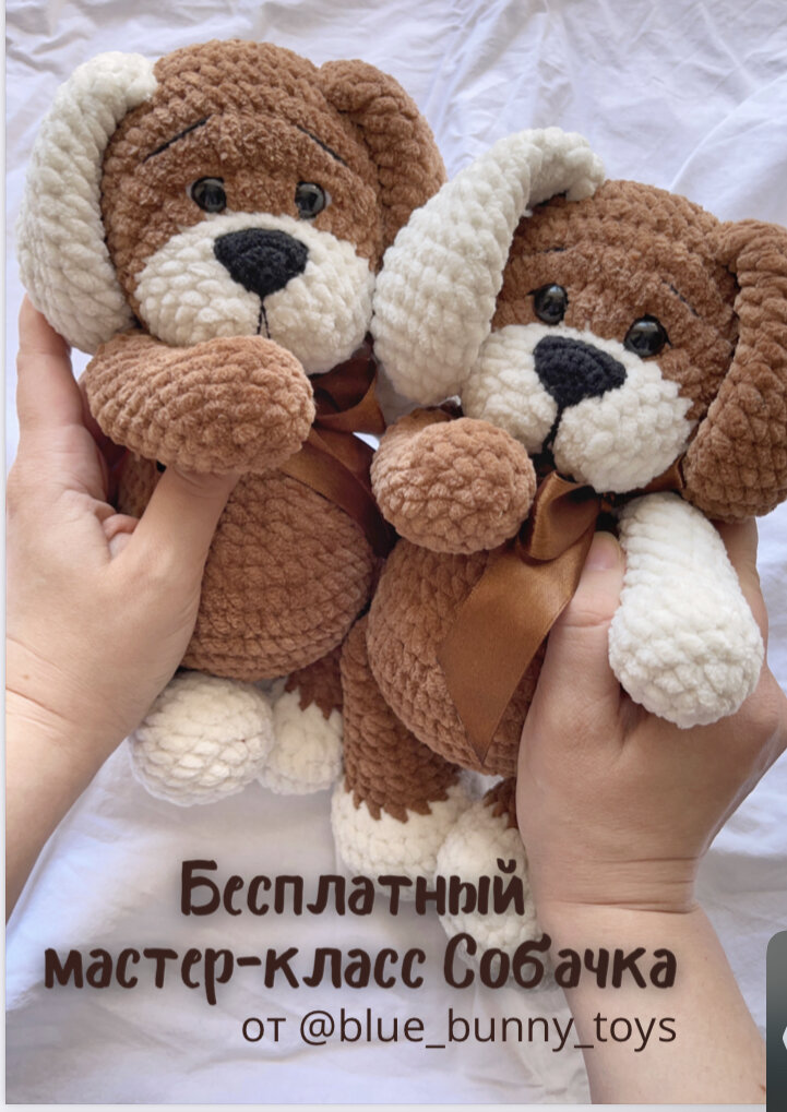 Размер готовой игрушки около 30 см! Внимание! Данный мастер-класс является авторской работой Тимофеевой Виктории (@blue_bunny_toys) Материалы: 1. Пряжа LaVita yarn velur – один моточек основного цвета и немного дополнительного. Вы можете использовать любой аналог плюшевой пряжи, где в 100 гр/120 м. 2. YarnArt jeans черная для оформления мордочки и носика 3. Наполнитель 4. Глазки 12 мм 5. Крючок No4 для вязания игрушки, No2 для вязания носика 6. Швейные булавки 7. Ножницы 8. Игла для пришивания деталей и вышивки лица 9. Плотная нить для пришивания деталей 10. Спицы для фиксации головы 11. Маркер для отметки начала ряда Обозначения: Ка- кольцо амигуруми Сбн – столбик без накида Пр – прибавка Уб – убавка Вп – воздушная петля Псн - полустолбик с накидом пп- петля подъема Сс - соединительный столбик (...)*n – повторить комбинацию в скобках n-ное количество раз Ушки: 1. 8 сбн в ка 2. 8 пр (16) 3. (1 сбн, пр)*8 (24) 4. (2 сбн, пр)*8 (32) 5-7. 32 (3 ряда) 8. (6 сбн, уб)*4 (28) 9. 28 сбн