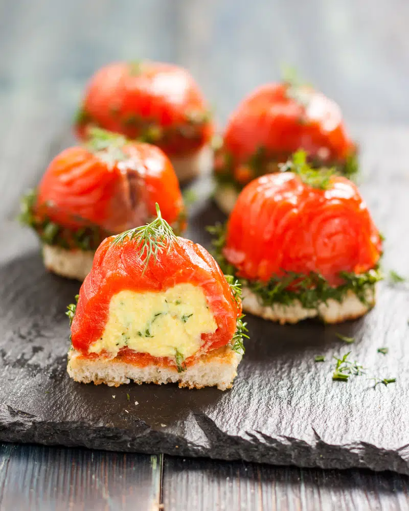 Канапе – это закуска праздничная, они привлекательно выглядят, похожи на небольшие пирожные. Их удобно брать из-за небольшого размера, часто канапе закрепляются шпажкой. Такой маленький бутерброд можно съесть за один укус. Лосось хорошо сочетается с мягким сыром. Красная рыба подойдёт для такой закуски любая: горбуша, сёмга, кета.