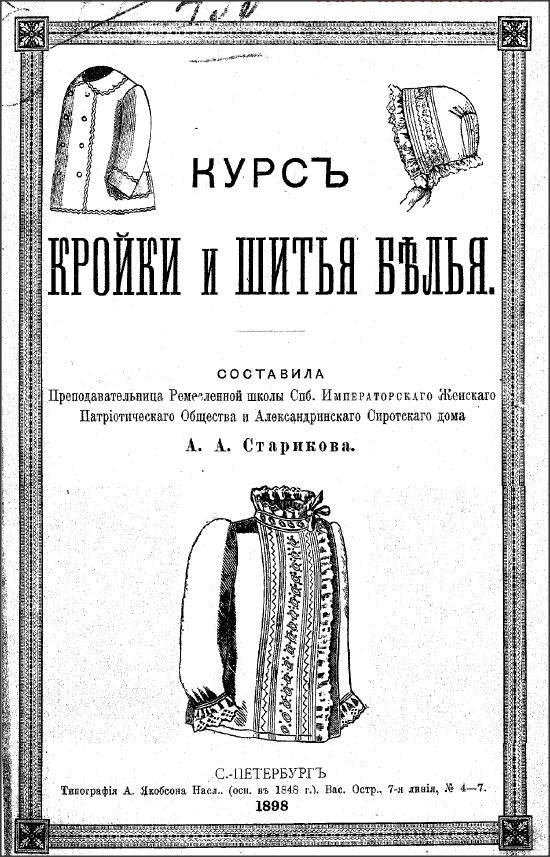Книга "Курс кройки и шитья белья" (1898) А. А. Стариковой - одно из тех изданий, по которому можно шить различные виды старинного белья: рубашки, ночные кофточки, нижние юбки, чепчики, панталоны и многое другое. Она также продаётся как репринт (например в "Читай-городе"). Я ознакомилась на практике с инструкциями по построению матинэ и нижнего лифа и расскажу о своём опыте и впечатлениях от изделий. "Курс" "составила Преподавательница Ремесленной школы Спб. Императорскаго Женскаго Патрiотическаго Общества и Александринскаго Сиротскаго дома А. А. Старикова." Прежде чем построить выкройку нижнего лифа, нужно подготовить выкройку ночной кофты, в чертёж которой затем вносятся изменения и дополнения для получения лифа и матинэ. Если ночная кофта свободная, матинэ - это полуприлегающая утренняя кофточка (подобная капоту - утреннему платью, только оно рекомендовалось дамам замужним, в отличие от матинэ, которая для девушек. Об этом можно почитать в репринте Ошин.) Снятие мерок.