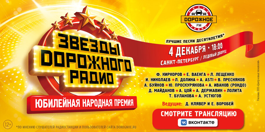 Дорогие слушатели, у нас есть отличная новость! Специально для тех, кто не сможет 4 декабря приехать в Санкт-Петербург на юбилейную церемонию вручения Народной премии «Звёзды Дорожного радио», мы организуем прямую трансляцию концерта. В каком бы уголке нашей необъятной родины вы ни находились, вы сможете увидеть выступление Льва Лещенко, Филиппа Киркорова, Игоря Николаева, Владимира Преснякова, Ларисы Долиной, Александра Иванова (Рондо), Лолиты и многих других звёзд российской эстрады на сцене Ледового дворца в Санкт-Петербурге. Смотрите прямую трансляцию концерта в официальной группе «Дорожного радио» во ВКонтакте! Не пропустите! Стартуем 4 декабря ровно в 18:00.