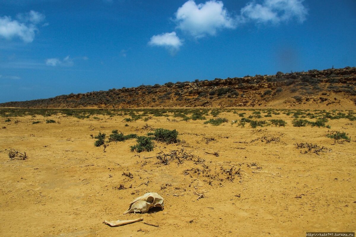 Вчера нам повезло выбрать правильную дорогу, а сегодня - нет. Мало того, нам не повезло вдвойне. Мы не просто выбрали неверный путь, но и решили срезать угол, чтобы поскорее выйти на него. Так, сразу после завтрака, не возвращаясь в Кабо, мы впервые углубились в пустыню Гуахира. Стоит сказать, что она оказалась не такой уж пустынной, как представлялась с вершины холма: иногда кактусы настолько тесно переплетались с колючим кустарником, что заросли, с легкостью рвущие не только одежду, но и пробивающие подошву, приходилось обходить, то и дело сбиваясь с нужного направления. Жара стояла невыносимая. Мудрый Андрюха еще со вчерашнего дня надел рубашку с длинным рукавом и укутал лицо футболкой, став похожим на араба в арафатке. Мне же было лениво ковыряться в вещах, поэтому шел, как обычно, думая, что вот если сегодня обгорю, то завтра точно оденусь как нужно. Через пару часов блуждания лишь по направлению стрелки навигатора, мы выпили почти всю воду, но вышли к заброшенной деревне, сост