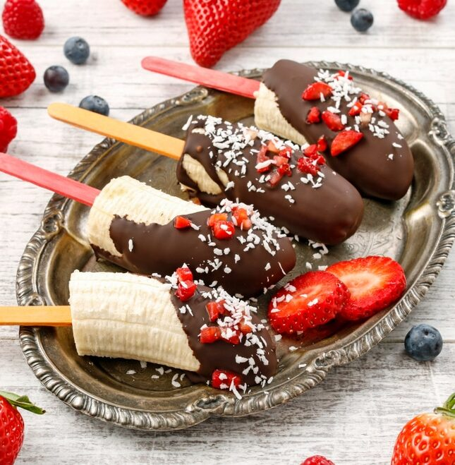 Любимый десерт деток и взрослых! Такая вкусняшка не только очень аппетитная, но и полезная. Много витаминов и микроэлементов в бананах и клубнике. Даже самым маленьким придется по душе такое интересное лакомство. По желанию можно посыпать шоколад орехами, сухофруктами, сублимированными ягодами и фруктами. Черный шоколад можно заменить белым или молочным. А для тех, кто не очень любит сладкое, можно взять горький шоколад с большим процентом какао. Нужно экспериментировать и найти свою золотую вкусовую серединку. Безумно вкусное сочетание банана, клубники и шоколада в одном десерте на палочке Пошаговый рецепт Ингредиенты