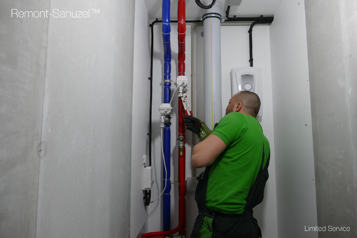 Сам блок управления был ранее установлен и запитан к сети. Сейчас только подключаем сервоприводы и коннектим 1 датчик, чтобы проверить систему. Остальные датчики подключим на этапе финишной установки сантехники…