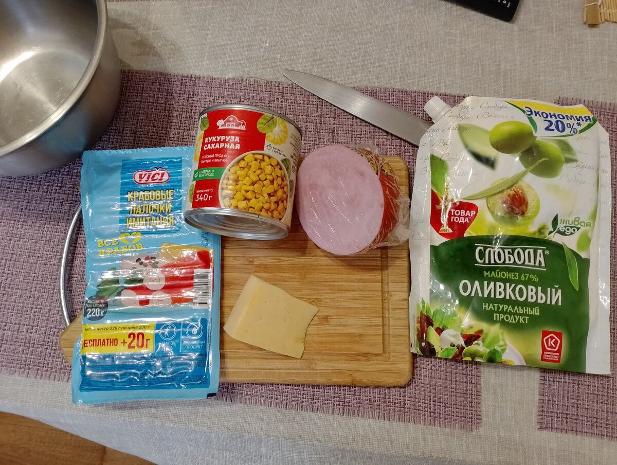 Майонез - 80 грамм 1 шаг Нарезаем кружочками крабовые палочки. 2 шаг Нарезаем соломкой ветчину. Складываем все в тарелку. 3 шаг Трем на мелкой терке сыр.Также в тарелку. 4 шаг Добавляем кукурузу. 5 шаг Майонез идет заправкой к салату. 6 шаг Перемешиваем.