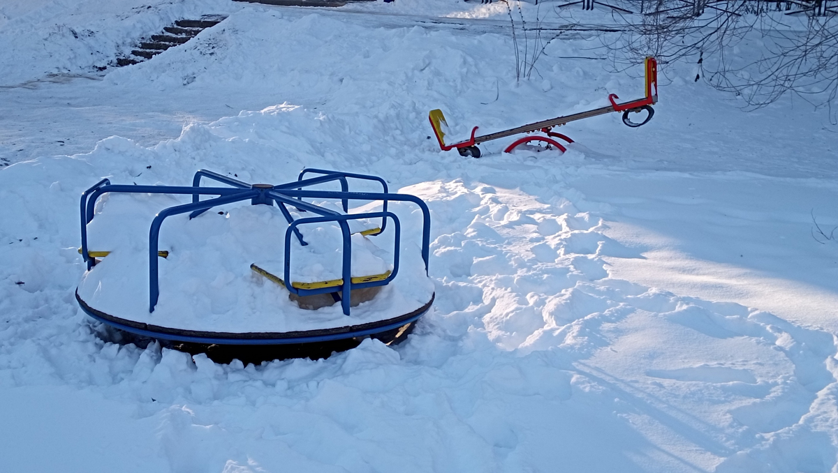 Улицы с горем пополам еще как то почистили и вроде бы это уже большое благо, но меня всегда волновал вопрос: а как же детские площадки? С одной стороны надо тебе выйди да почисть, но реально кто должен отвечать за площадку? Сами жильцы или же городские службы, или Управляющая компания? Пока в этом вопросе, видимо, не разобрались. На фото вполне наглядно видно, что дети пытаются играть на площадке, но из-за обилия снега этого сделать никак не получается. А когда снег притопчется многие объекты будут просто не функциональны. При этом на первом фото в левом верхнем углу кадра можно заметить, что парковка рядом с домом неплохо почищена. Получается, места для машин почистить можно, а вот площадку, увы...
