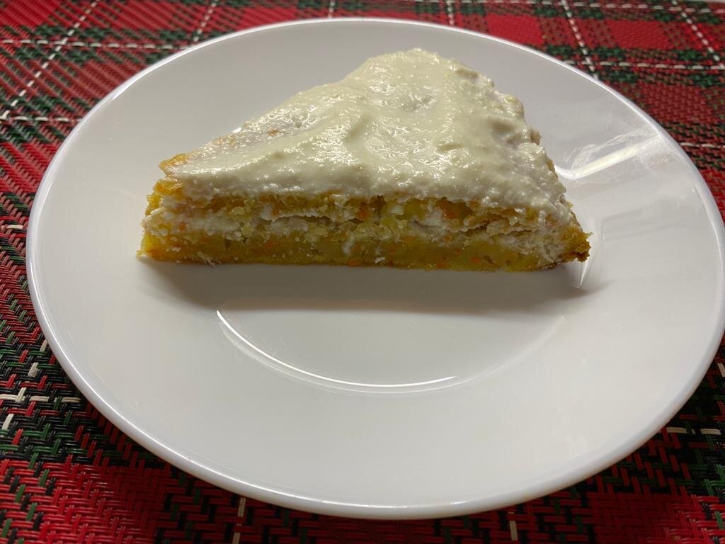 7. Разрезаем наш морковный корж вдоль и промазываем одну половину частью крема. Накрываем второй половиной бисквита и выливаем сверху оставшуюся часть крема, разравниваем. Убираем в холодильник минимум на 60 минут охладиться и пропитаться.