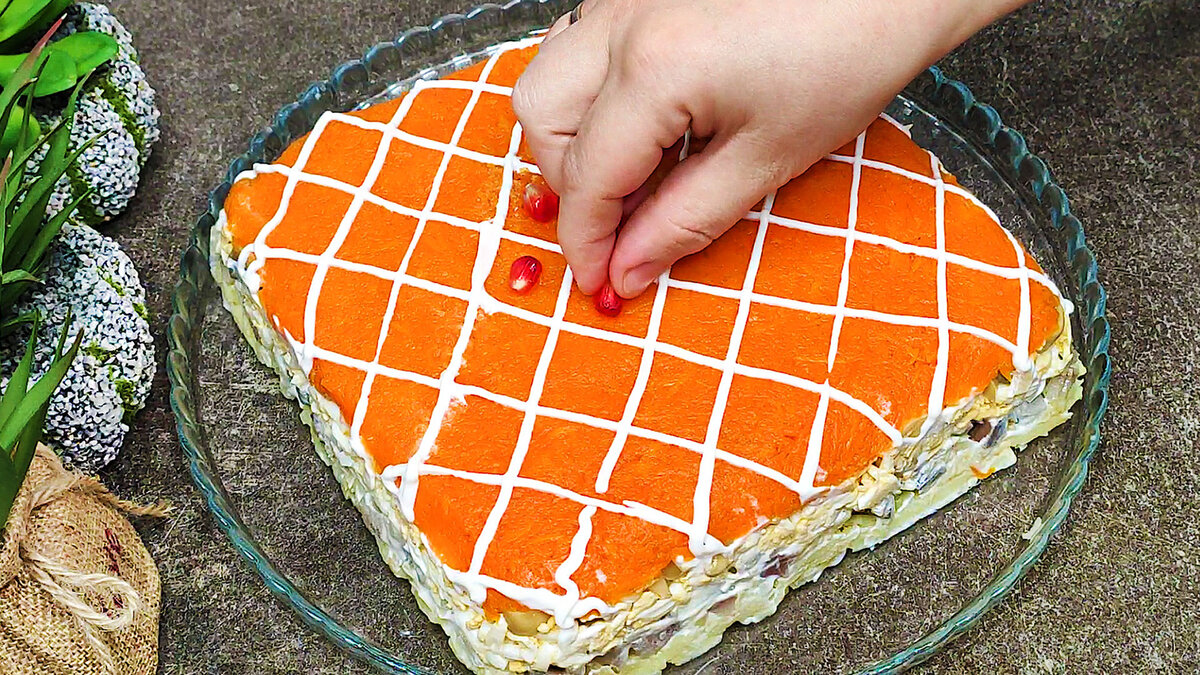 Мелко нарезаем луковицу Вареную картошку натираем на крупной терке На крупной терке натираем вареные яйца Подпишитесь на мой канал Ольга Лунгу Морковь натираем на мелкой терке Маринованные грибы нарезаем на тонкие слайсы Филе сельди нарезаем на небольшие кубики Собираем салат перевертыш, форму диаметром 21*21 см застилаем пищевой пленкой и на дно выкладываем морковь, разровнять Делаем сеточку из майонеза и выкладываем маринованные грибы Сверху распределяем натертые яйца и промазываем майонезом Нарезанный лук выкладываем на вареные яйца и сверху распределяем филе рыбы, промазать майонезом Последним слоем выкладываем картошку ,немного посолить и слегка промазать майоне