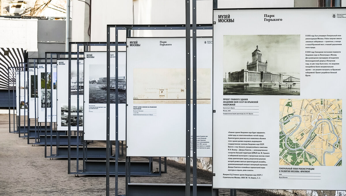 Во дворе Музея Москвы, между зданиями Провиантских складов, открылась выставка, посвященная юбилею одного из самых молодых парков столицы История парка, окружающего здание Новой Третьяковки, началась в 1956 году, когда Совет Министров СССР принял решение организовать парк искусств с двумя выставочными залами на территории от Якиманской набережной до Крымского моста. Проект доверили коллективу мастерской Ивана Жолтовского. В 1962 году планы изменились — вместо двух должно было появиться одно здание длиной 300 метров с лаконичным фасадом и контрастными барельефами. Но и этот проект претерпел изменения: в конце строительства фасад облицевали белым мрамором и оставили гладким. Вокруг выставочного здания спроектировали парк, который должен был продолжать зеленую ось Парка культуры. Но из-за проблем с финансированием строительство комплекса затянулось. В 1979 году была введена в эксплуатацию часть здания, принадлежавшая Союзу художников СССР, — она получила название Центрального дома художни