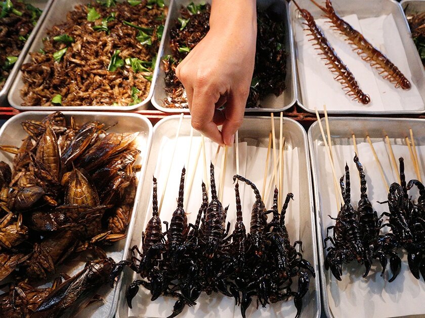 Также в тайских лавках со стрит-фудом можно заметить скорпионов, но с ними нужно быть поосторожнее. Перед употреблением убедитесь, что из хвоста скорпиона удалено ядовитое жало. А самые отчаянные храбрецы могут попросить у продавца живого скорпиона.