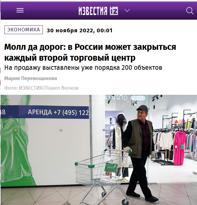 А в 2022 году крупные куски ТЦ рушат актуальные события - огромные проблемы возникли у кинотеатров в составе ТЦ, которым стало нечего показывать (а на российское кино народ чё-то не идет). Закрыты множества магазинов, а их место другие компании пока занять не поспешили.