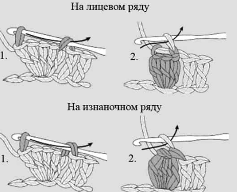 Может быть выполнен из 2-6 столбиков. Показано из 5 ст. с/н. На лицевой стороне. Шаг 1: Провязать 5 ст. с/н в четвёртую петлю от крючка для первого столбика попкорна. Шаг 2: Сбросить петлю с крючка, вставить крючок спереди назад в верх первого ст. с/н группы, поднять сброшенную петлю и протянуть через столбик и плотно стянуть (ст. п-к готов) Ст. п-к на изнаночной стороне. Шаг 1: Провязать 5 ст. с/н в указанную петлю (4-я петля от крючка для первого ст. п-к). Шаг 2: Сбросить петлю с крючка, вставить крючок сзади вперёд в верх первого ст. с/н группы, поднять сброшенную петлю и протянуть через столбик, плотно стянуть 1 ВП ( ст. п-к готов).