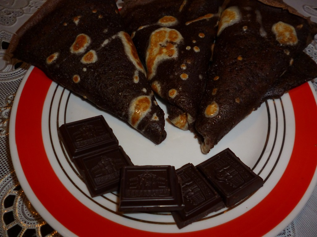 Ингредиенты для 20 блинов: мука-250 г; яйца-3 шт.; молоко-3 стакана; манка-1 столовая ложка ( это и есть секретный ингредиент); какао-порошок- 25 г; сода питьевая-1 чайная ложка без верха; соль- по вкусу; растительное масло-5 столовых ложек
