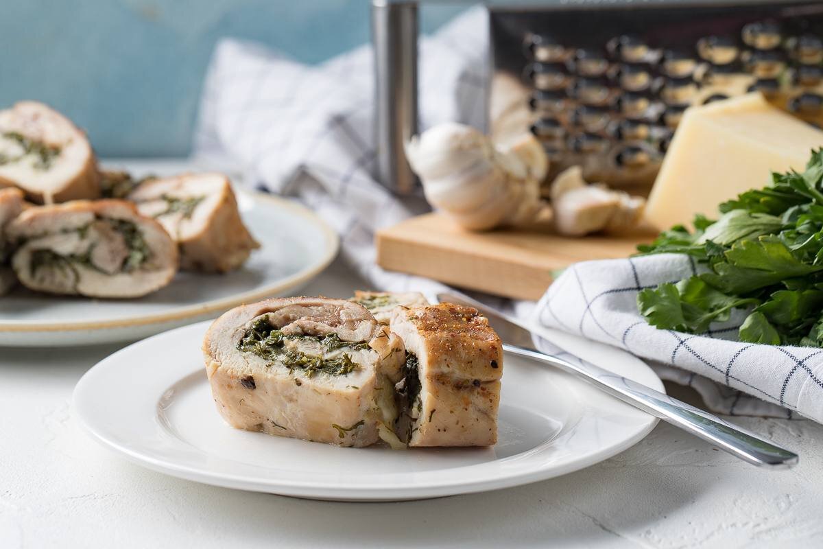 Ингредиенты: - Куриные бедра без кости - 400 г. - Сыр - 50 г. - Зелень - 50 г. - Чеснок - 2 зубчика - Соль, перец - по вкусу 🧑🏻🍳 Приготовление: 1. С куриных бедрышек снять кожицу и отделить от костей. От того места, где была кость, сделать надрезы в стороны, но не до конца. Развернуть филе в один пласт и слегка отбить. Посолить и поперчить. 2. Сыр натереть на терке, зелень измельчить, чеснок пропустить через чеснокодавилку. Смешать зелень, сыр, чеснок. 3. Выложить начинку на бедра и разровнять. Свернуть филе рулетом и завернуть в фольгу. Выпекать при температуре 180С примерно 35-40 минут.