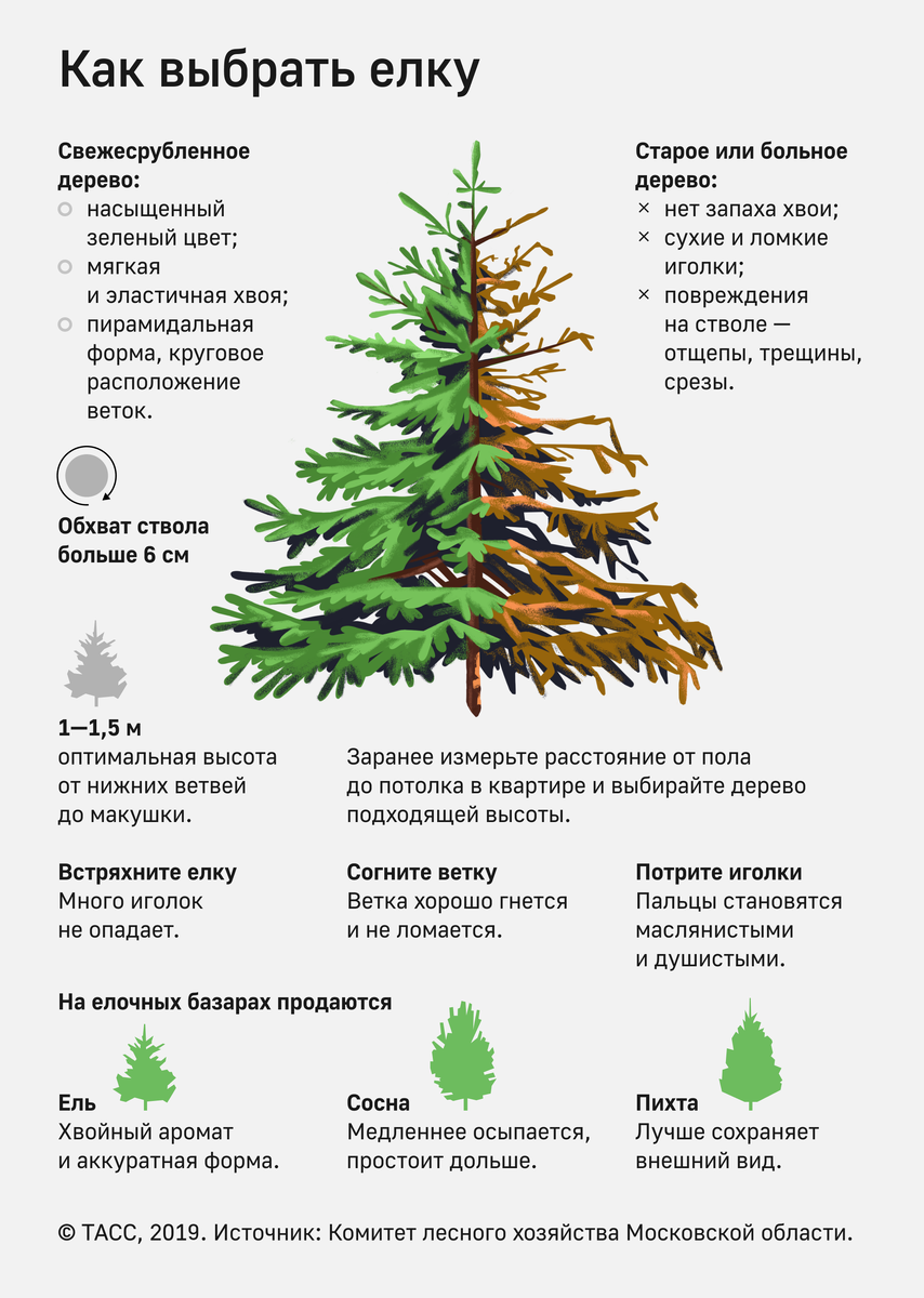 Елочные базары будут работать в Москве с 20 по 31 декабря. Там можно будет приобрести ели из Пермского края и Башкирии, пихту или лапник. На некоторых базарах будут продавать игрушки, электрические гирлянды и подставки для деревьев. При покупке живой ели или сосны в специализированном месте вы можете быть уверены, что не наносите ущерба экологии. Деревья, которые продаются в таких точках, выращиваются в питомниках специально к новогодним праздникам. Чтобы хвойное дерево поместилось в квартиру, заранее измерьте расстояние от пола до потолка. Оптимальная высота новогодних елей, сосен или пихт составляет 1–1,5 м от нижних ветвей до макушки. Отличить свежесрубленное дерево от старого или больного можно по его иголкам. Они должны быть мягкими, эластичными, обладать хвойным запахом и не сильно опадать. Медленнее всего осыпается сосна, а пихта дольше сохраняет внешний вид. Подробнее о том, как выбрать главный новогодний атрибут, — в инфографике ТАСС.