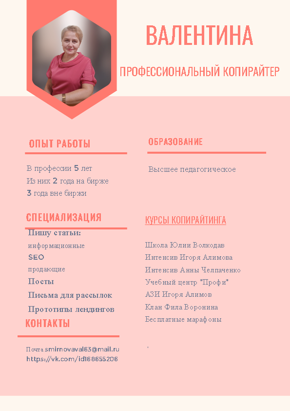 Часто работодатель просит копирайтера прислать своё резюме. Поэтому, нужно иметь под рукой уже готовое, чтобы быстро переслать информацию. В сети можно найти примеры оформления резюме и информацию, которую стоит размещать. Желательно иметь текстовый документ. В нём нужно указать: Фамилию, имя Образование Специализацию Опыт работы Пройденные курсы Контактные данные Чем вы можете помочь и какие услуги оказать, а также другую, на ваш выбор полезную информацию. Чем больше навыков из смежных или разных областей, тем больше шансов заинтересовать работодателя. В текстовом формате резюме рекомендуют при описании делать упор на то, чем вы можете помочь потенциальному заказчику. Удобно держать под рукой и графически оформленное резюме. Люди не любят читать много информации, перенасыщены. В таком виде кратко и конкретно указываются основные данные претендента на вакансию. Есть множество графических редакторов, которыми можно пользоваться. Одним из самых лучших является Canva. Но в настоящее время