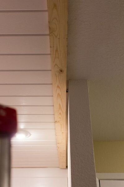 Используйте деревянные шпонки для закрепления местоположения нижней доски по отношению к боковым, для создания балки, в которой нижняя часть слегка углублена внутрь. Это создаст узкую тень, придающую глубину балкам, когда будут установлены на потолке.